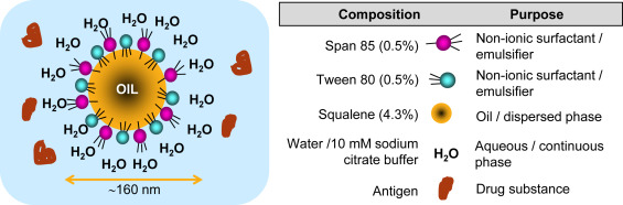 MF59 به عنوان ادجوانت واکسن آنفولانزای فصلی FluAd® در کانادا برای نوزادان 6 ماه تا 2 سال و در ایالات متحده برای افراد مسن 65 سال و بالاتر تائید شد [[i],[ii]]. MF59 داراي ذرات یکسان تقریبا برابر 160 نانومتر است و اجزاء اصلی آن روغن اسکوالن و سورفاکتانت هاي غیر یونی Tween 80 و Span 85 هستند. MF59 دوز آنتی ژن مورد نیاز را می کاهد و ایمنی زایی گسترده اي ایجاد می کند. از طرفی با توجه به اینکه در سال های گذشته مورد استفاده انسانی قرار گرفته، ایمنی آن نیز ثابت شده است. فرضیه دپو براي MF59 نیز همانند آلوم رد می شود. در مقابل MF59 محیط ایمنی مناسبی را درون ماهیچه ایجاد میکند که باعث افزایش پاسخ هاي ایمنی ویژه آنتی ژن می گردد. دیگر مطالعات پیشنهاد می کنند که MF59 میتواند به طور مستقیم و یا غیرمستقیم به عنوان سیستم تحویلی آنتی ژن عمل کند ؛ فاگوسیتوز و پینوسیتوز را بالا برده و مصرف آنتی ژن توسط APC را افزایش دهد. سلول هاي دندریتیک گرفته شده از خون انسانی به طور مستقیم با استفاده از MF59 فعال نمی شوند. در مقابل MF59 مونوسیت ها، ماکروفاژها و گرانولوسیتها را براي تولید کموکاین هايCCL2 و 4 CCL3 ،CXCL8 ،CCL تحریک می کند. از طرفی مونوسیتهاي تحریکشده، دچار تغیرات فنوتیپی میشوند تا بیشتر به DC تبدیل گردند [[iii]]. به علاوه گزارش شده است که MF59 در مقایسه با آلوم، سلول هاي ایمنی را به میزان بیشتري فعال میکند و باعث مصرف بالاتر آنتی ژن واکسن در محل تزریق میگردد.