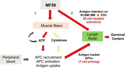 همچنین MF59 در مقایسه با آلوم یا واکسن هاي فاقد ادجوانت، تعداد APC های ارایه دهنده آنتی ژن را در عقده هاي لنفاوي زهکشی شده (DLN) افزایش می دهد [[iv]]. در برخی مطالعات اثر ادجوانتی MF59 مستقل از اینفلامازوم[1] NLRP3 و Caspase1 ذکر شده است [[v]]. این در حالی است که اثر MF59 وابسته به پروتئین هاي apoptosis-associated Speck-like داراي دومین ASC است که تعدیل کننده معمول کمپلکس هاي اینفلامازوم هستند. لذا این احتمال وجود دارد که ASC دارای عملکردی مستقل از اینفلامازوم باشد و یا در اینفلامازوم هایی به غیر از NLRP3 نقش ایفا کند.[[vi]]