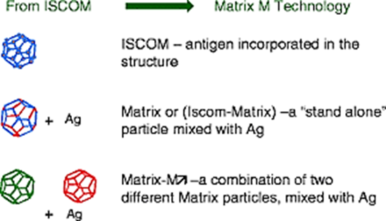 ادجوانت ماتریکس M (شکل1-3) یک ادجوانت مبتنی بر ساپونین است که توسط کمپانی Novavax ثبت و تجاری شده است و پاسخ های ایمنی هومورال و سلولی قوی تر و طولانی تر نسبت به ادجوانت های مرسوم می دهد.
